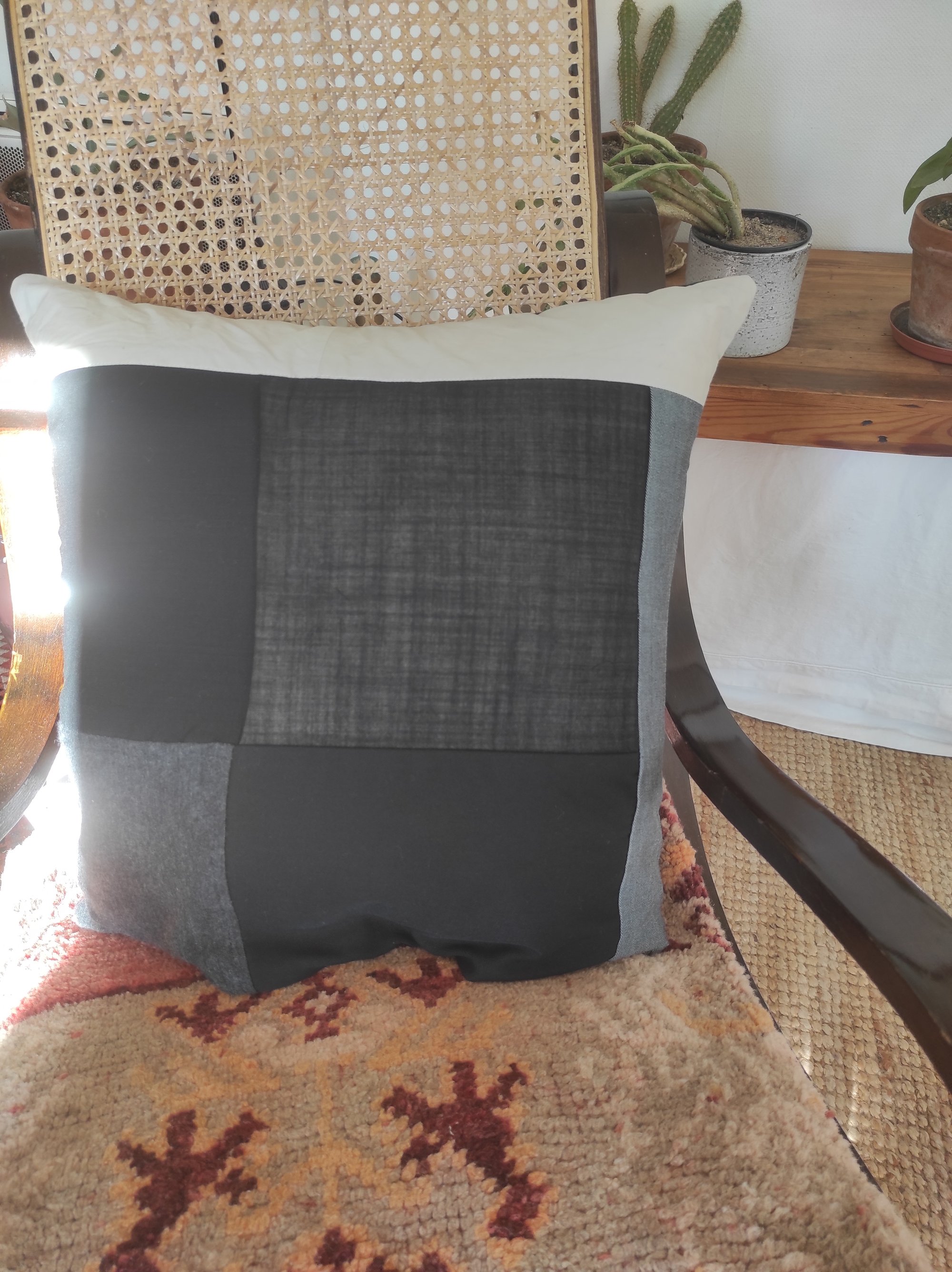 Elle est composée d'un patchwork de tissu issu de l'upcycling, tissus chinés en brocante, chutes de matières d'anciennes collections...