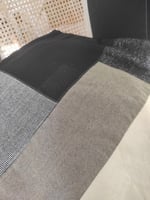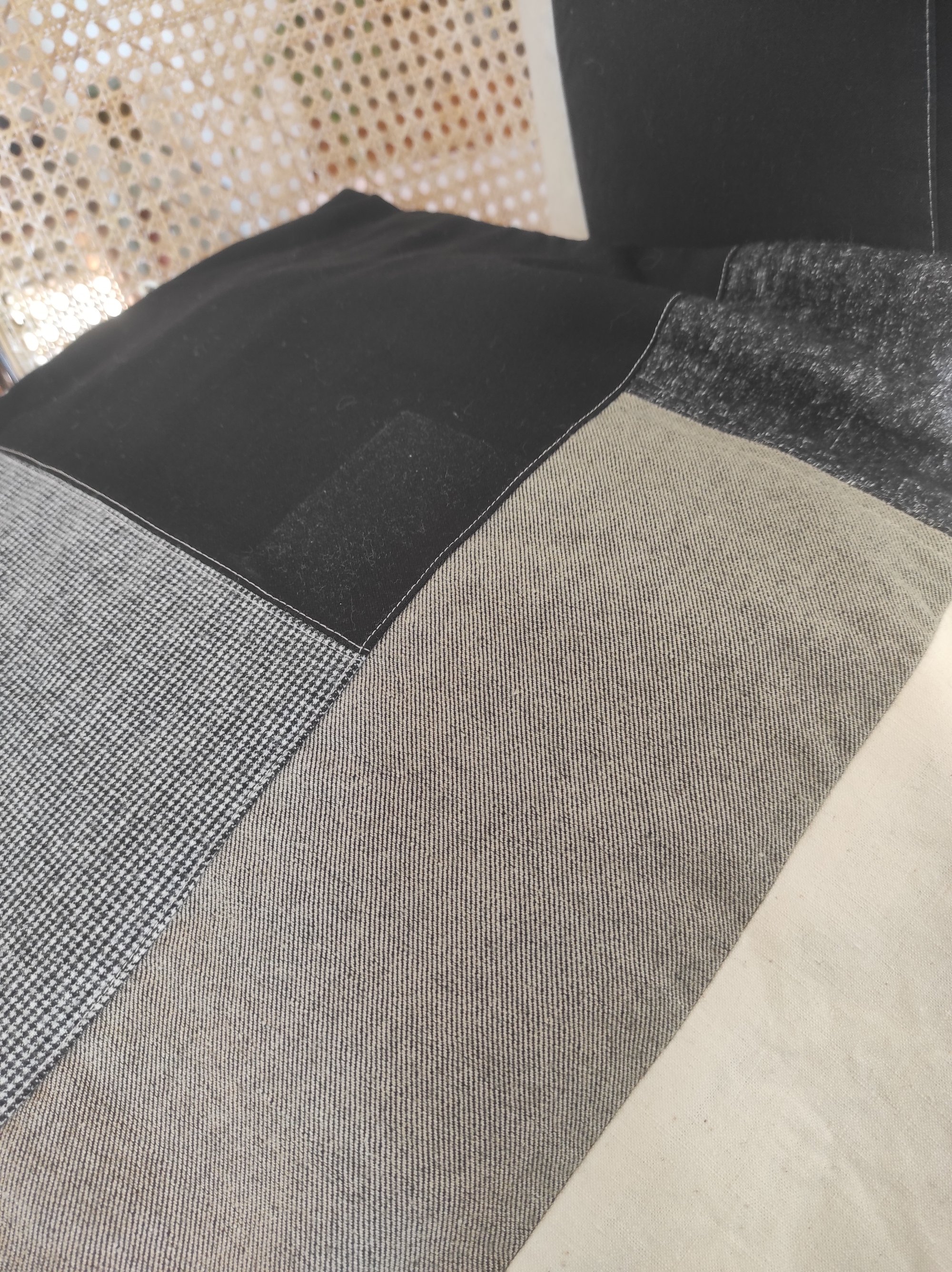 Elle est composée d'un patchwork de tissu issu de l'upcycling, tissus chinés en brocante, chutes de matières d'anciennes collections...